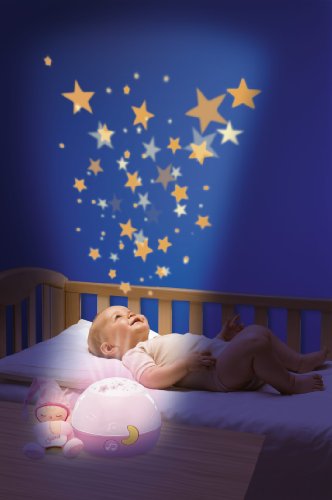 Description : Proiettore che crea una magica atmosfera per la nanna: l'incanto delle stelline proiettate e il rilassante sottofondo musicale conciliano il sonno del neonato, rassicurandolo. Le melodie di Bach, Rossini, i brani New Age e i suoni della natura sì susseguono in una selezione ideale per offrire un primo importante approccio alla musica. Il proiettore può essere utilizzato anche come lampada colorata, che accompagna con le luci soffuse il bambino nel mondo dei sogni. Il simpatico pupazzo può essere staccato dalla stella sulla quale è seduto e diventare un morbido compagno di gioco. Funziona con 3 pile AA da 1,5V (non incluse). Età: dalla nascita.