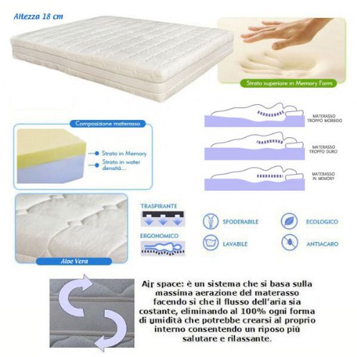 Descrizione: Materasso memory foam soft touch con tessuto in aloe vera. Spessore esterno 18 cm (interno 16 cm)
