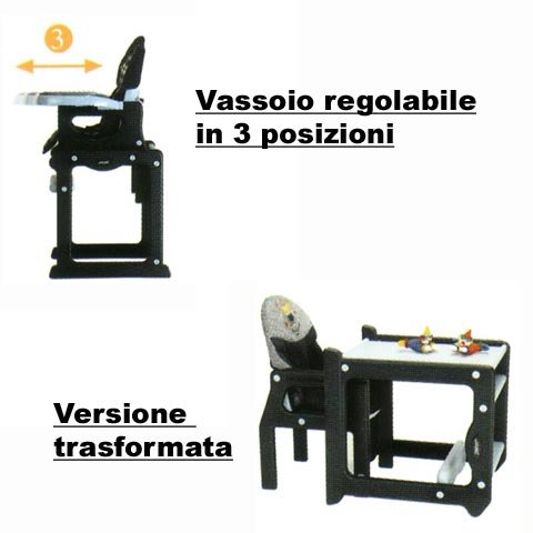 Description : Seggiolone trasformabile in sediolina con tavolino incorporato.